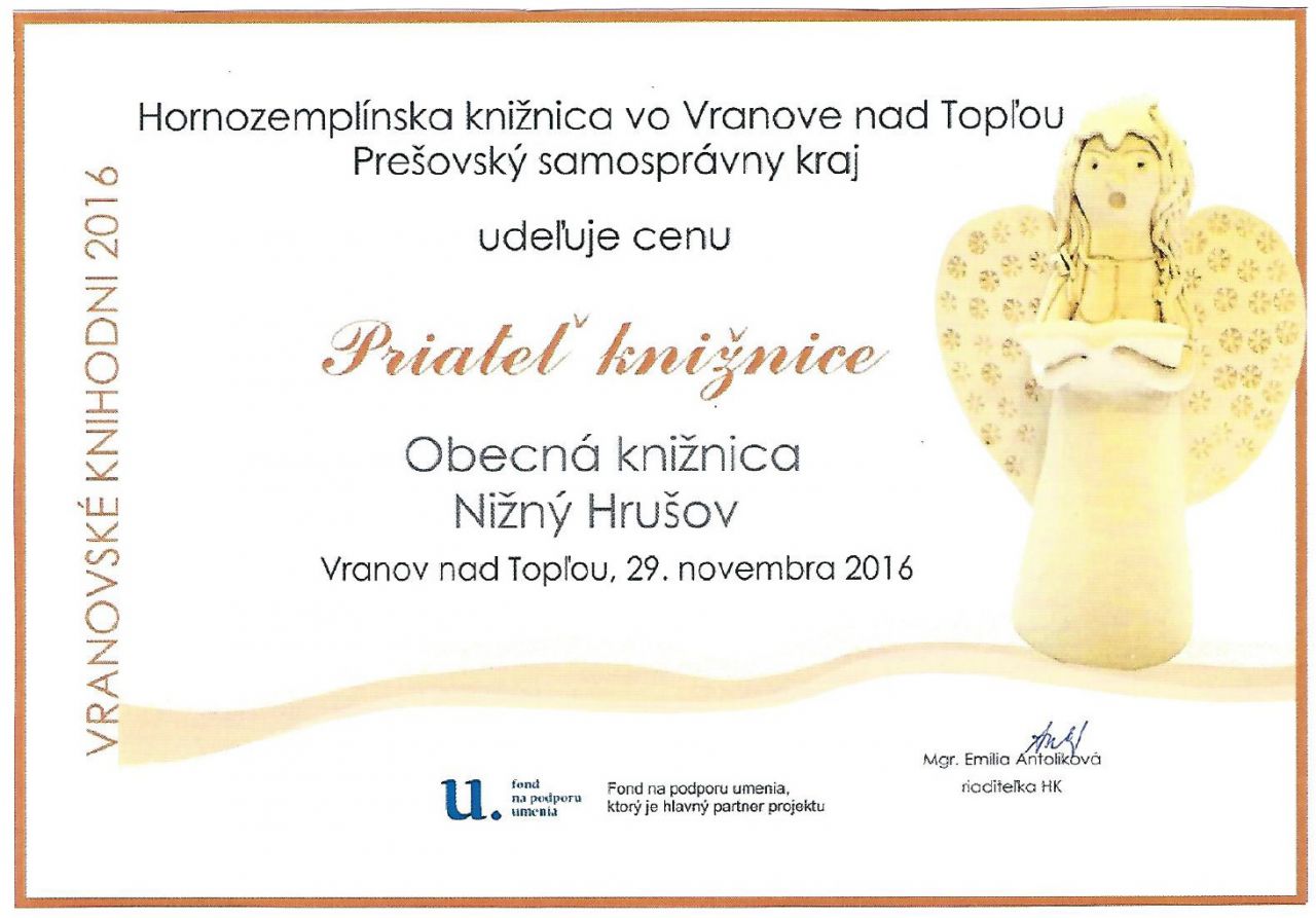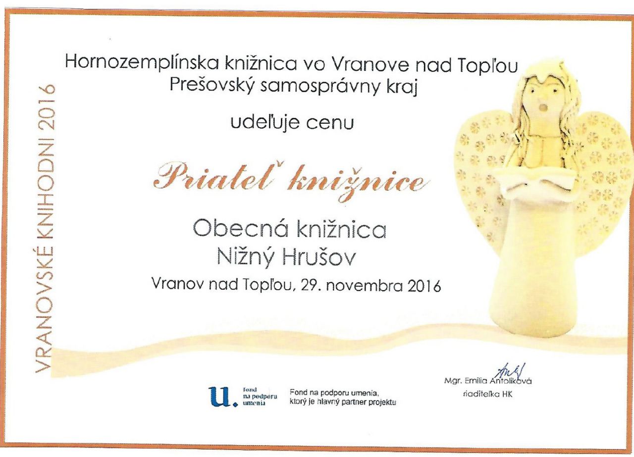 S radosťou Vám oznamujeme, ze Hornozemplínska knižnica Vranov nad Topľou udelila ocenenie našej Obecnej knižnici. Ocenenie prevzal starosta obce v utorok 29.11.2016 v hoteli Patriot na knižnom večeri. Za toto ocenenie vďačíme Ing. Slávke Boguskej, ktorá sa aktívne podieľa na zveľadovaní a napredovaní našej knižnice. Zároveň ďakujeme všetkým, ktorí v roku 2016 zakúpili alebo darovali knihy do knižnice a rozšírili knižný fond a čitateľom obce za návštevnosť .
