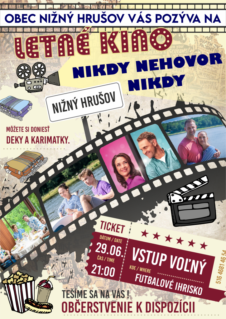 Obec Nižný Hrušov pozýva všetkých do letného kina v sobotu 29.6.2024 so začiatkom o 21:00 hod. na futbalovom ihrisku.