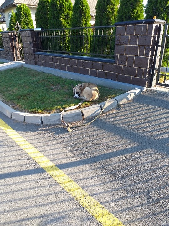 V centre obce na autobusovej zastávke sa našiel väčší pes hnedej farby. Pes je zachytený s vodítkom medzi obrubníky a nemôže sa pohybovať.