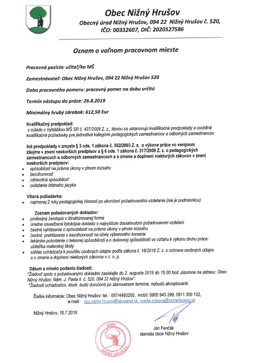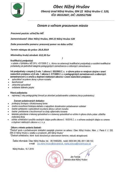 Voľné pracovné miesto - učiteľ/ka MŠ. Viac info tu.