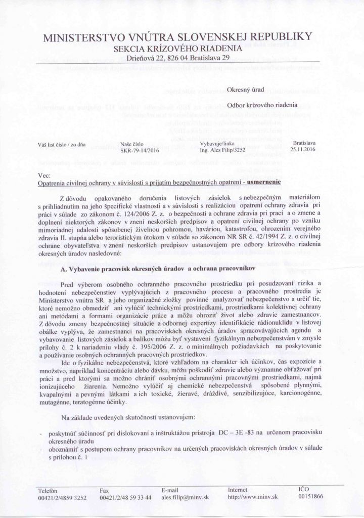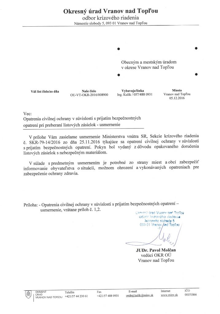 Z dôvodu opakovaného doručovania podozrivých listových zásielok s nebezpečným materiálom bolo vydané usmernenie z Ministerstva vnútra SR, sekcia krízového riadenia č. SKR-79-14/2016 zo dňa 25.11.2016 na základe ktorého obec zabezpečuje informovanie obyvateľstva o situácii, možnom ohrození a vykonávaných opatreniach pre zabezpečenie ochrany zdravia. Žiadame občanov, aby venovali zvýšenú pozornosť preberaniu listových zásielok, ktoré majú: