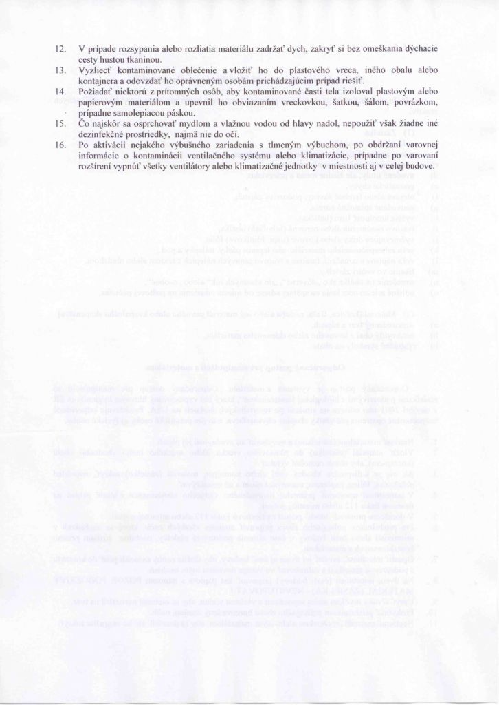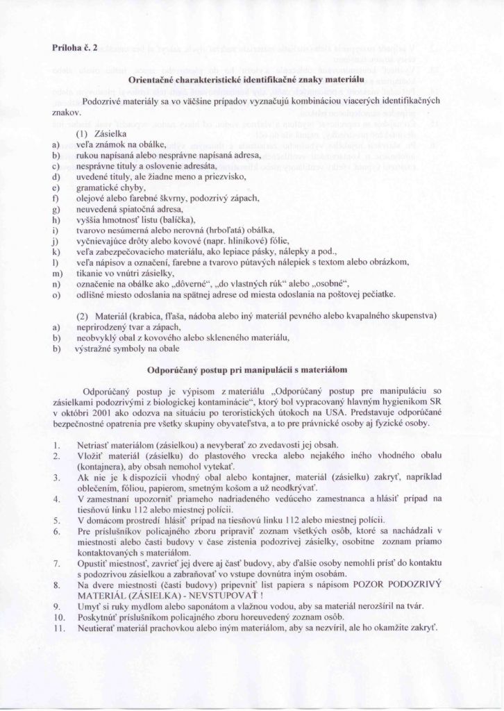 Otváranie listových zásielok odporúčame realizovať v samostatnej uzavretej miestnosti s ochrannými prostriedkami. Pri zistení podozrivej zásielky okamžite kontaktovať tiesňovú linku 112 alebo políciu, miestnosť uzavrieť a okamžite vykonať základnú osobnú hygienu ( umyť ruky mydlom alebo saponátom a vlažnou vodou ).