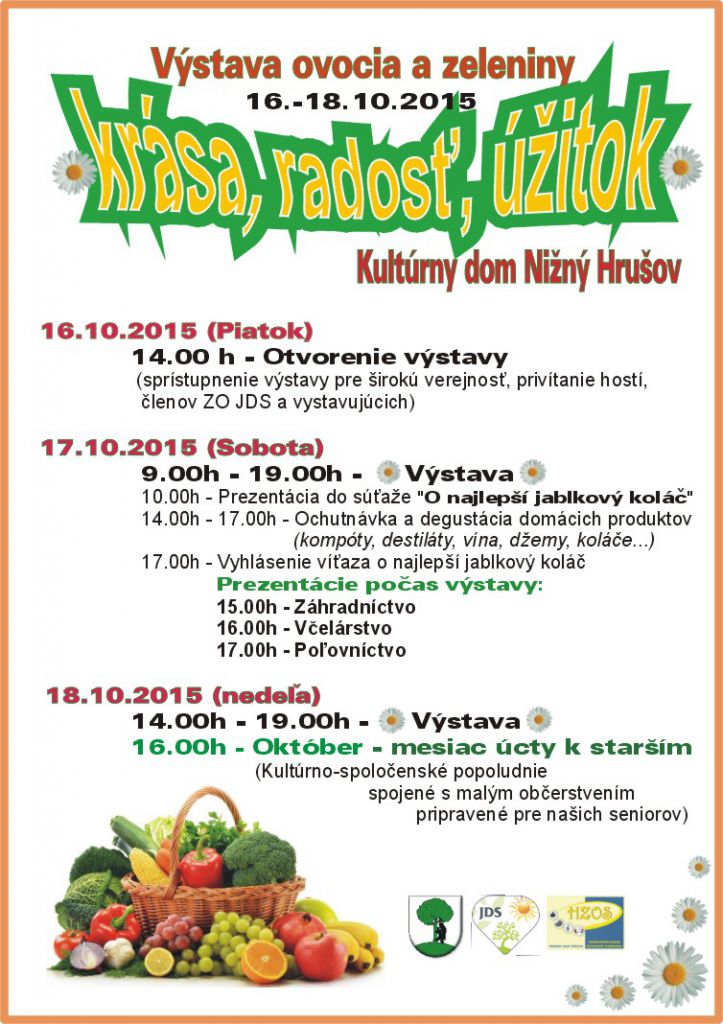 Srdečne pozývame občanov našej obce na výstavu ovocia a zeleniny "Krása, radosť, úžitok" v kultúrnom dome v dňoch od 16.10.2015 do 18.10.2015.