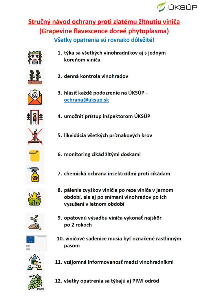 Vzhľadom na rýchly nárast viditeľných príznakov karanténnej choroby viniča s názvom zlaté žltnutia viniča (Grapevine flavescence dorée phytoplasma), Vám odbor ochrany rastlín Ústredného kontrolného a skúšobného ústavu poľnohospodárskeho v Bratislave zasiela naliehavé informácie na zamedzenie šírenia tejto choroby. Všetky tieto informácie boli zároveň zaslané na obecné a mestské úrady obcí, ktoré patria medzi vinohradnícke obce Slovenska (spolu 715 obcí). V prílohe oznamu nájdete tieto informácie: