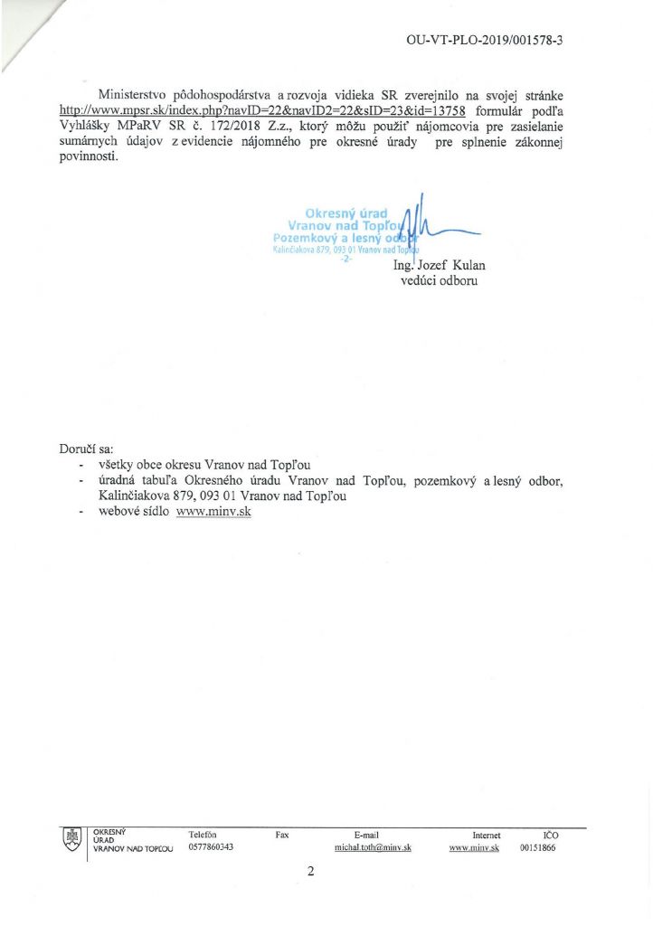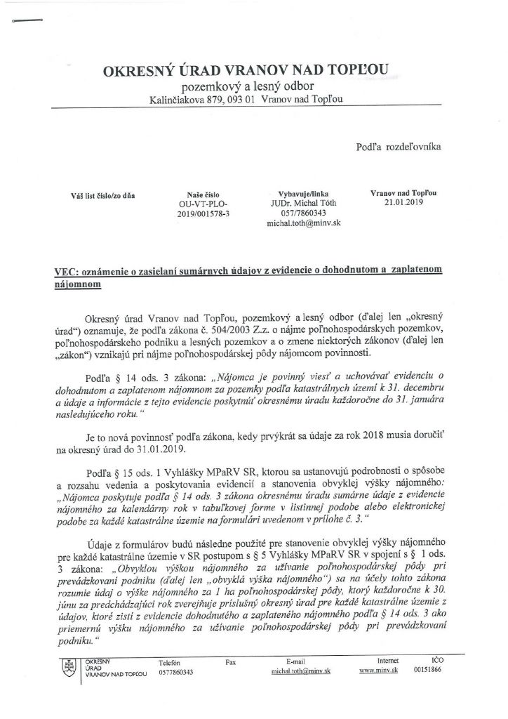 Oznámenie o zasielaní sumárnych údajov z evidencie o dohodnutom a zaplatenom nájomnom.