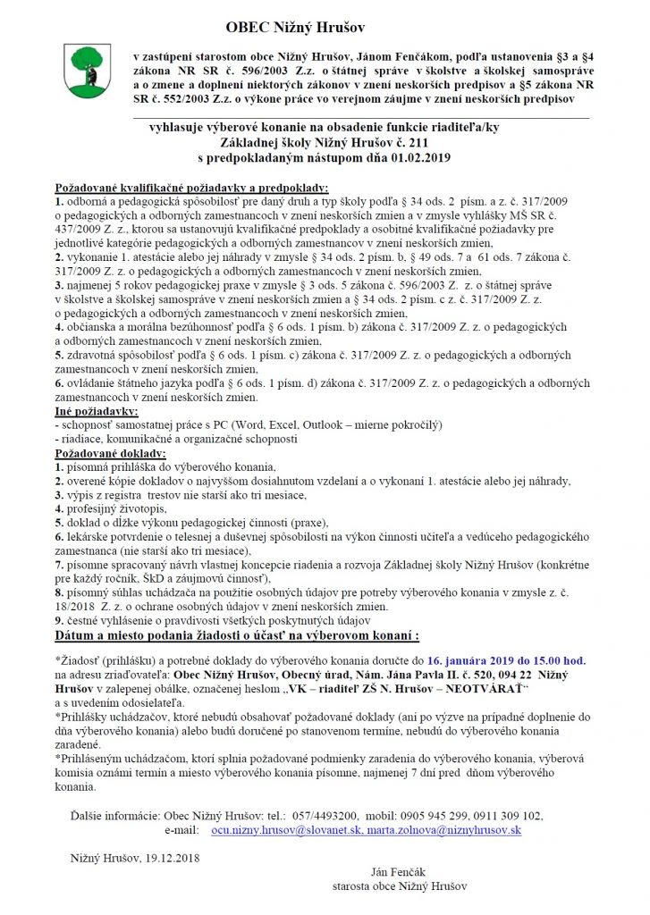 Vyhlásenie výberového konania na obsadenie funkcie riaditeľa/ky Základnej školy Nižný Hrušov. Viac info tu.