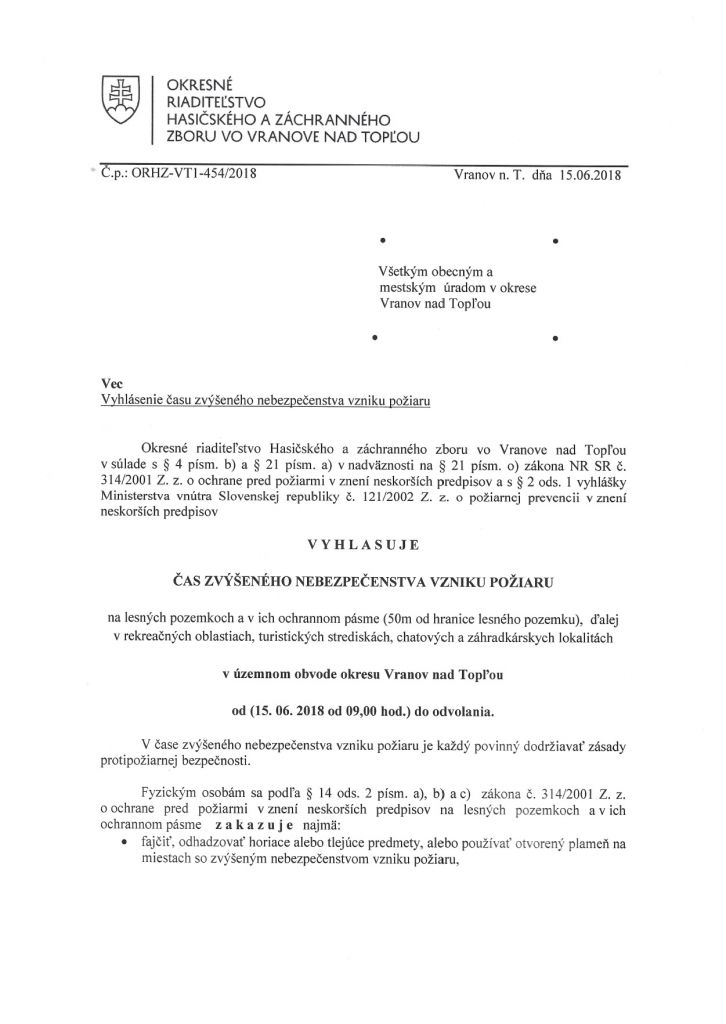 vyhlásenie času zvýšeného nebezpečenstva vzniku požiaru