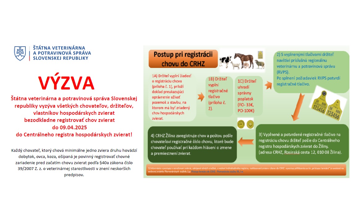 Štátna veterinárna a potravinová správa Slovenskej republiky vyzýva všetkých chovateľov, držiteľov, vlastníkov hospodárskych zvierat k bezodkladnej registrácii chovu zvierat do 09.04.2025 do Centrálneho registra hospodárskych zvierat!